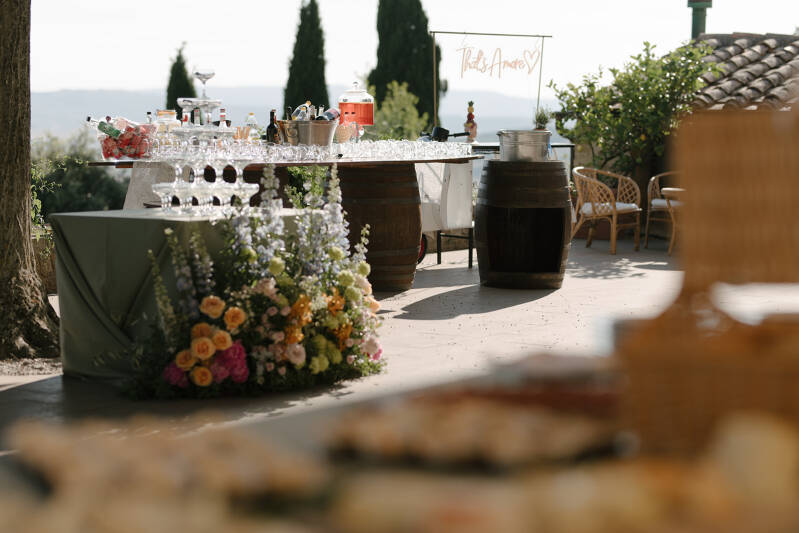Na de ceremonie proostten M&T met hun gasten bij zonsondergang, met de Toscaanse heuvels als perfecte achtergrond voor een ontspannen en feestelijke sfeer.