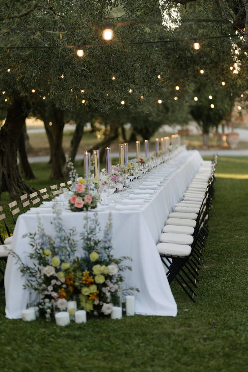 De avond zette zich voort met een romantisch diner in de olijfgaard, waar de tafels elegant waren gedekt en honderden kleine lichten de bomen verlichtten.